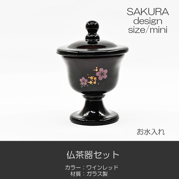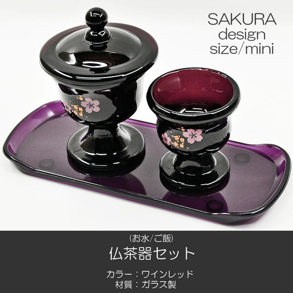 ミニサイズでコンパクト さくら模様入り 専用台付き仏茶器セット 商品説明カラーワインレッド 材質ガラス製※専用台/プラスチック製 サイズ 水 入:幅5.5cm×高さ7.8cmご飯入:幅4.5cm×高さ4cm 専用台:縦6cm×横14.5cm セット内容水入れ/ご飯入れ/専用台 お届け方法こちらの商品は宅配便(ヤマト通常配送)でのお届けとなります。