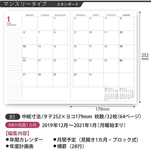 サイズ:セミB5(中紙寸法:252×179mm)タイプ:スタンダード・マンスリー枚数:32枚(64ページ)掲載月:2019年12月~2021年1月(月曜始まり)製本:糸かがりとじ材質:表紙=上質紙内容:年間カレンダー・年度計画表・月間予定(見開き1か月・ブロック式)・横罫(28行)品番ニ-CMB-B5-20この商品について 必ずご確認ください配送についてメール便での配送になります。