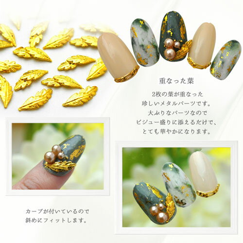 製品情報 梱包数 5粒 サイズ 横4mm×縦13mm 発送方法 メール便190円/佐川急便470円(沖縄・離島以外)/ゆうパック410円〜 用途 ジェルネイル・レジン用品 オススメポイント 重なった葉(Overlapping leaves) 2枚の葉が重なった珍しいメタルパーツです。